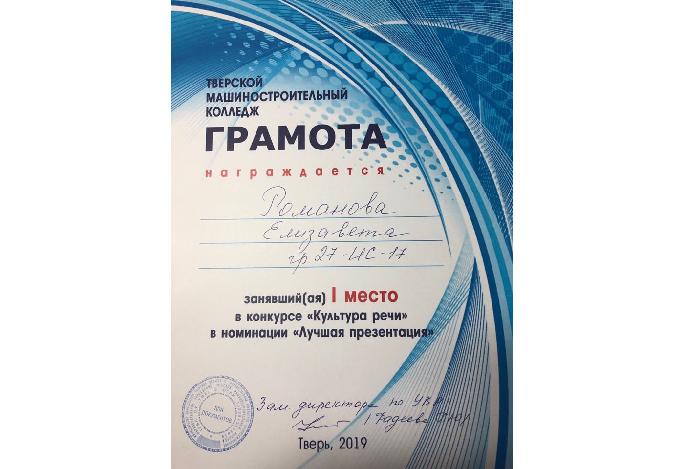 Грамота награждается Романова Елизавета студентка Тверского машиностроительного колледжа занявшиеся 1 места в конкурсе "Культура речи" в номинации "Лучшая презентация"