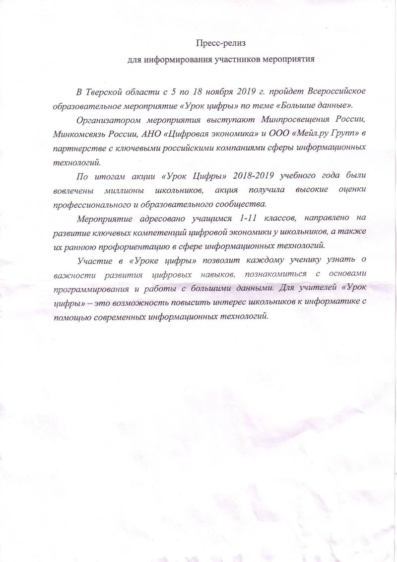 Главная Новости колледжа Мероприятие 06.11.2019 Мероприятие В Тверской области с 5 по 18 ноября пройдет всероссийское образовательное мероприятие “Урок цифры”